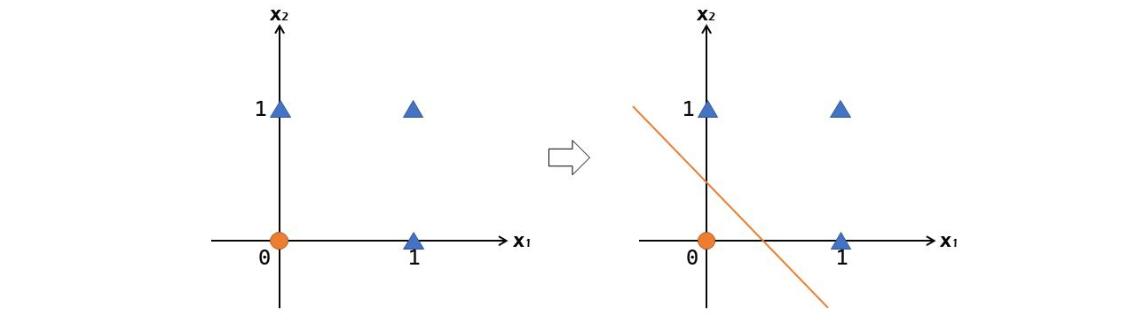 AND, NAND, OR 게이트 등은 2차원의 공간 상에 표현했을 때, 하나의 선만으로 빨간 동그라미와 파란 세모와의 구역을 구분지을 수 있었다. 예를 들면, 아래는 OR 게이트를 시각화한 것이다.