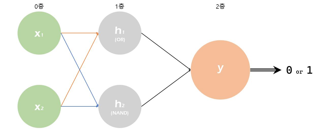 위의 표에서 알 수 있듯이, NAND와 OR 게이트를 거친 정보가 AND로 조합되어 최종적으로 XOR과 같은 결과를 보인다는 사실을 알 수 있다. 겨우 4개의 점이 맞냐 아니냐를 판단하는 게 뭐 그리 대수냐고 할 수 있겠지만, 사실 이 XOR 문제 해결의 핵심은 비선형의 문제를 선형 문제의 조합으로 풀 수 있다는 데에 있다.