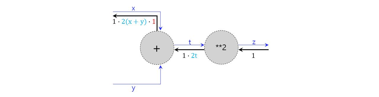 예를 들어 $z = t^2$이고 $t = x+y$일 때, $x$에 대한 $z$의 미분값은 다음과 같이 구할 수 있다.