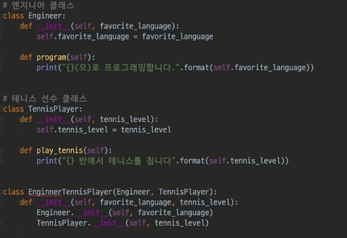 : 따라서 파이썬에서 다중 상속을 할 때는 (1) 부모클래스끼리 같은 이름의 메소드를 갖지 않도록 하거나 (2) 같은 이름의 메소드는 자식클래스에서 오버라이딩 해야지 혼동을 막을 수 있다.