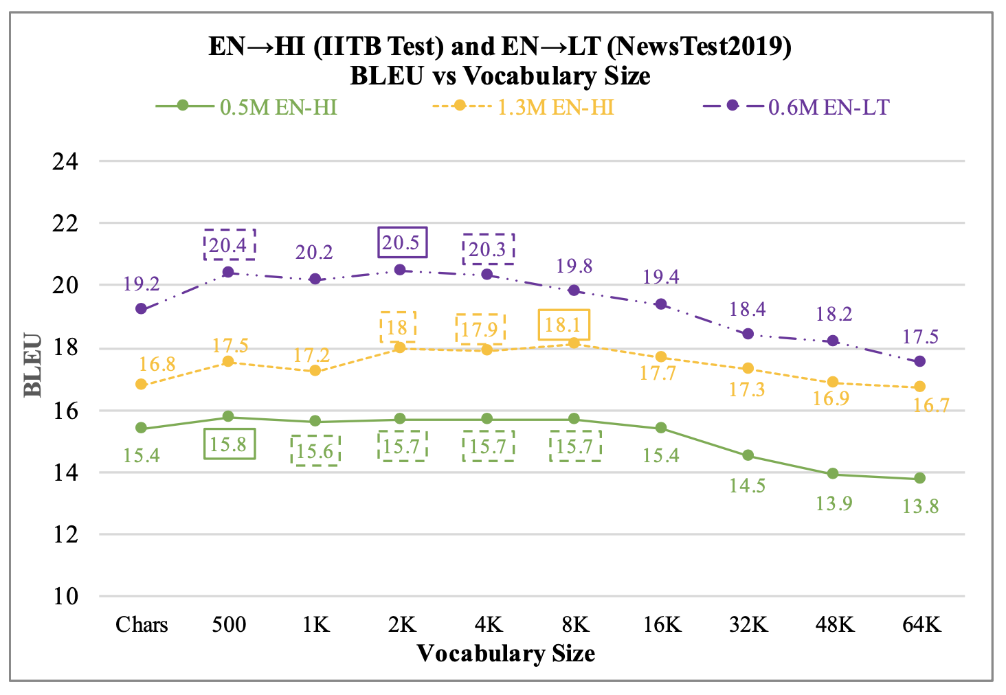 - 다양한 언어와 데이터 사이즈에서 다양한 vocabulary size가 NMT 성능에 미치는 영향을 분석하고,