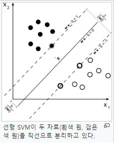 데이터를 사상된 공간에서 표현했을 떼, 데이터 경계 사이에 선을 그어 가장 큰 폭을 가진 경계를 찾는 알고리즘이다. (출처 : 위키피디아)